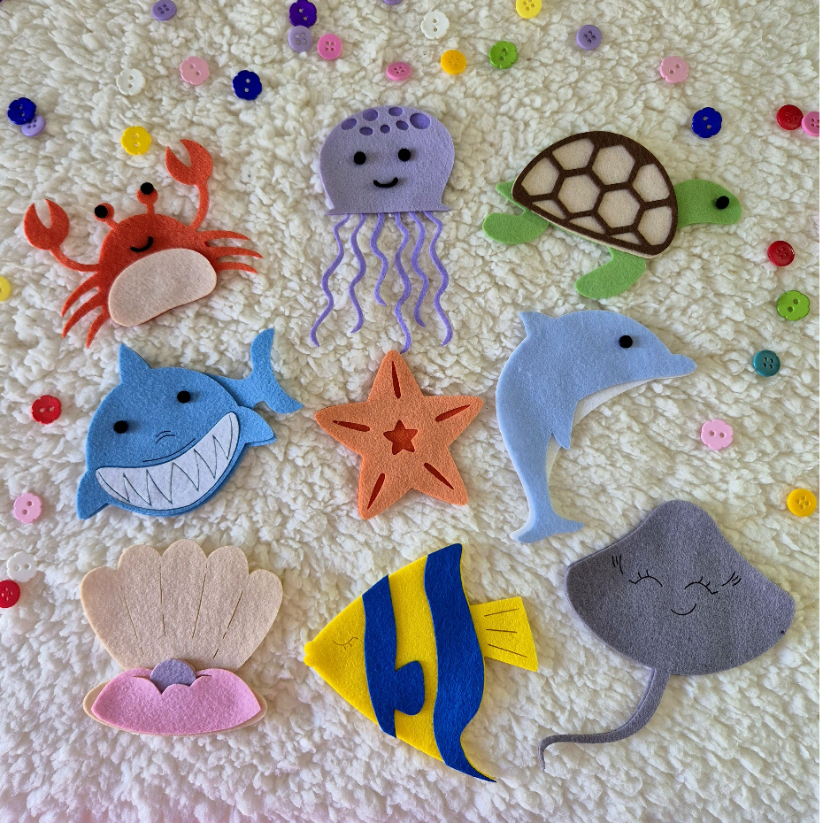 São 9 bichinhos feitos com todo carinho em feltro: do tubarão sorridente à delicada estrela do mar. Cores vivas, corte preciso e muita fofura em cada detalhe.